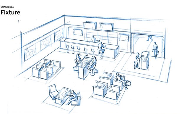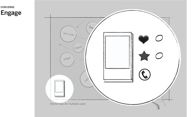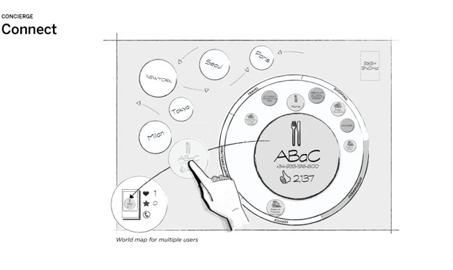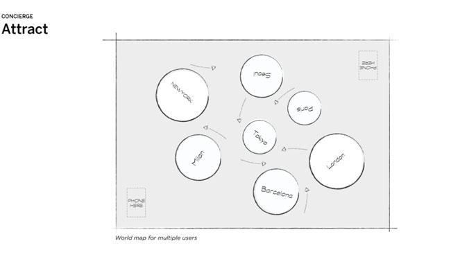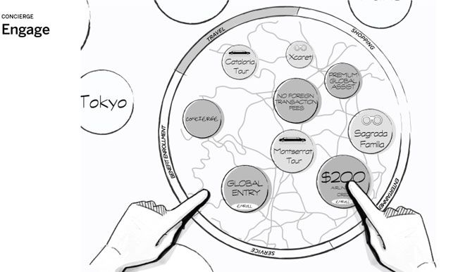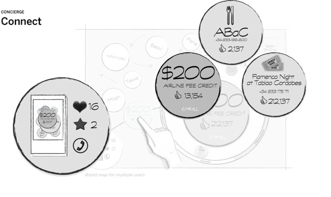 Concierge is one of the final approaches that allows a user to save & enroll in certain benefits through his/her smartphone on the geo-based touch table. Users can bubble-up relevant benefits by location depending on where they are and where they are going. This geo-based interaction allows travelers to sample and enroll in Platinum benefits accessible to them around the globe and based on their specific destination.